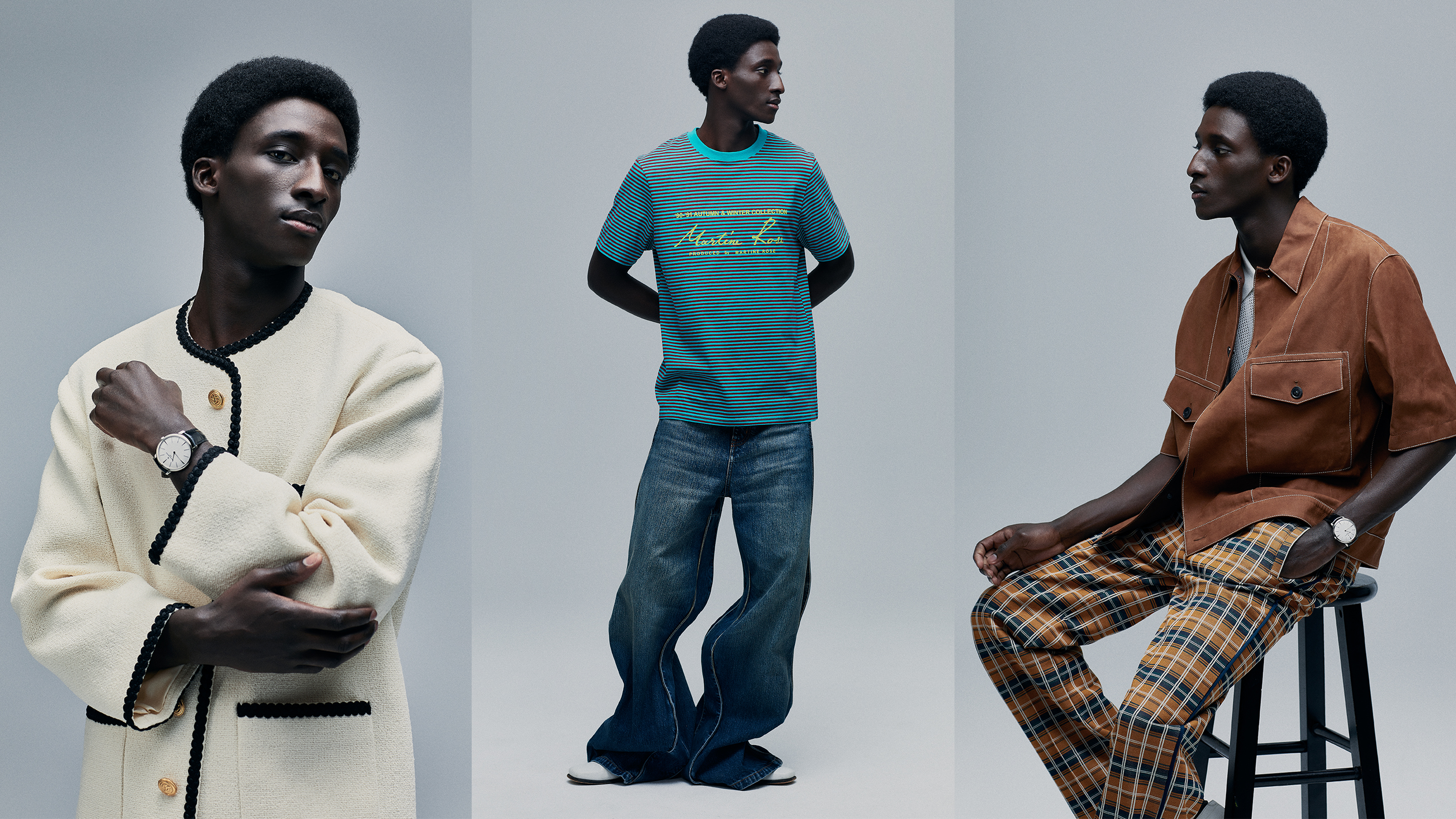 T-shirt and shoes Celine by Hedi Slimane; Jacket and jeans Vintage from What Goes Around Comes Around.