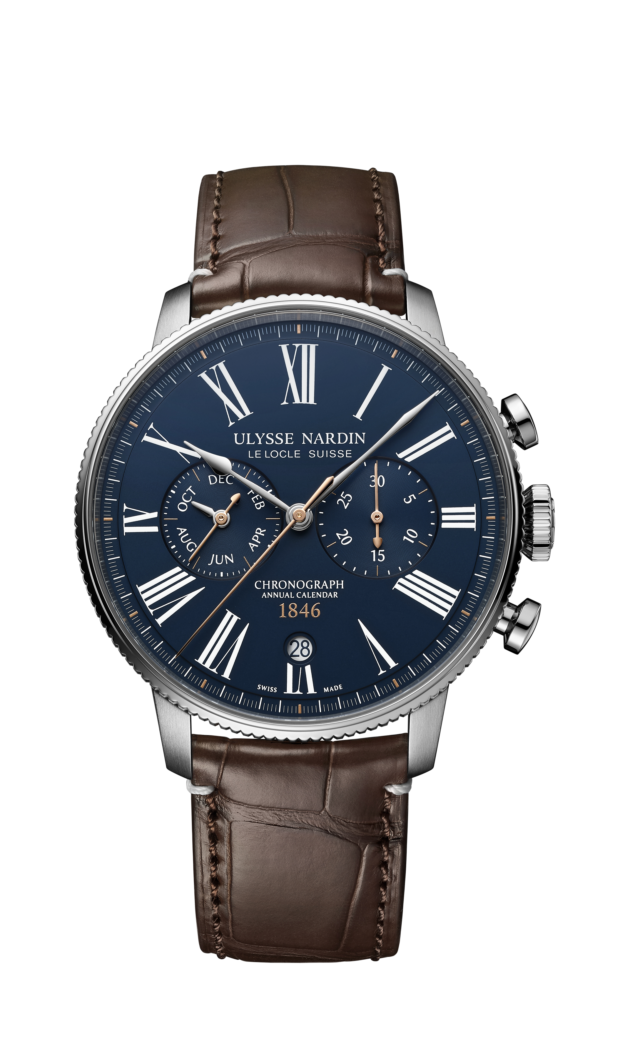 The annual chronograph is a fascinating series of complications. The Marine Torpilleur Annual Chronograph can tell time from the month and date right down to 1/10 of a second. With a design that doesn't deviate drastically from a standard chronograph, a large amount of information can be gleaned. It's no wonder that the annual calendar was one of Ulysse Nardin's earliest hits; because of its ability to time down to 1/10 of a second, it served as a timekeeper at the 1936 Olympics held in Berlin. This new model is an improvement on the 1996 design by Ludwig Oechslin of Ochs & Junior that resulted in the UN-150 movement. Every aspect of the annual calendar data is easily adjusted using the crown, making it easy for the wearer.