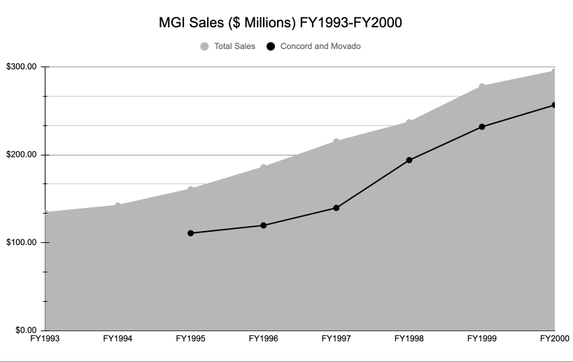Movado is a public company, so we don't have to rely on Morgan Stanley/LuxeConsult turnover estimates; MGI publishes quarterly and annual reports. Sales are not broken out by brand within the group, but by looking at the "Owned Brands" (Movado, Concord, Ebel, MVMT, and Olivia Burton) category in the report, we can draw some conclusions about Movado brand performance.