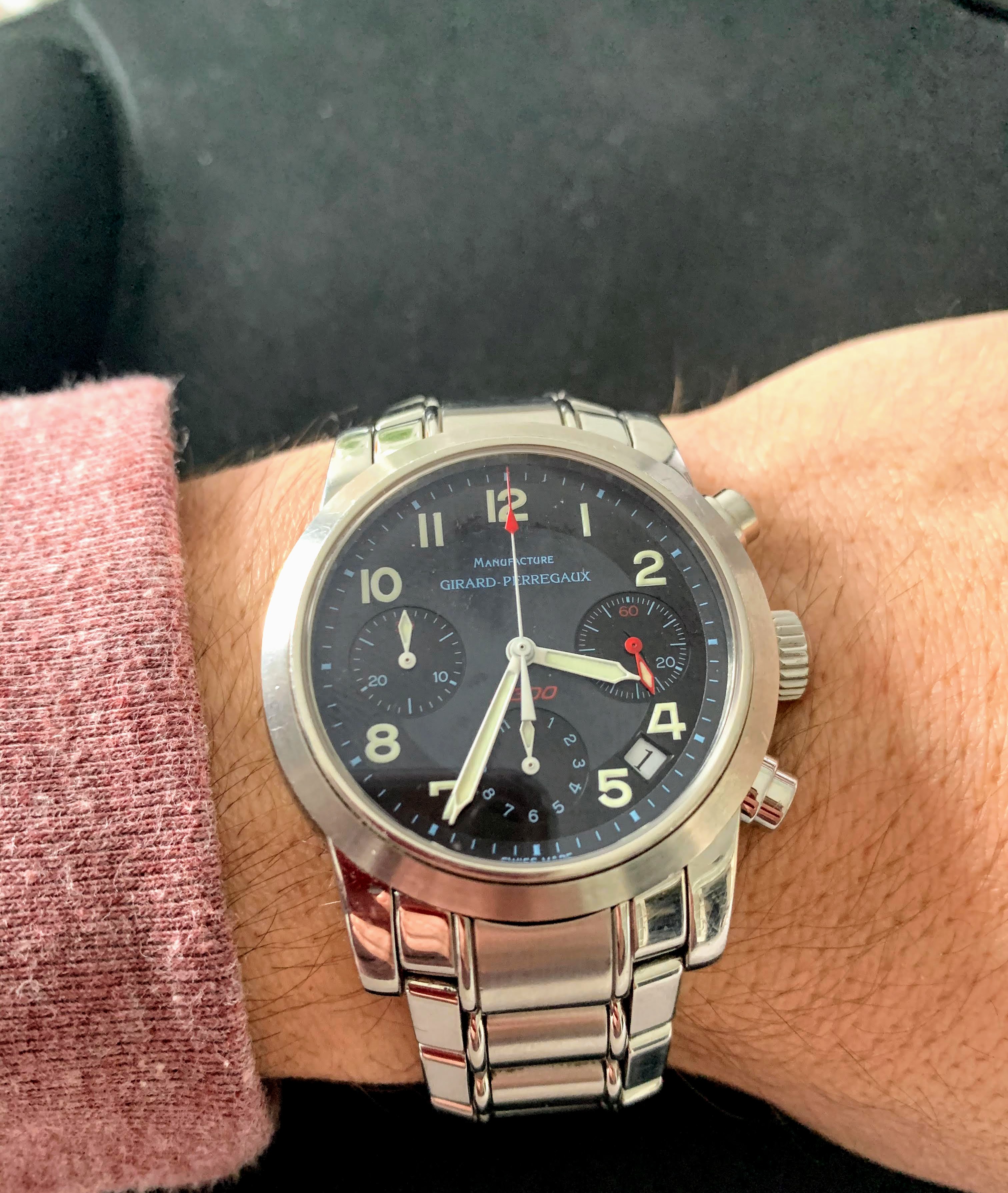When Nicholas was a kid, his uncle had a Ferrari, and this Girard-Perregaux F300 Ferrari Chronograph – both of which Nicholas thought were pretty cool. That uncle promised him the watch one day, but actually gave it to Nicholas's brother, along with another watch. Nicholas did eventually end up with the GP, and wears it often – and hopes to wear it while driving a Ferrari one day.